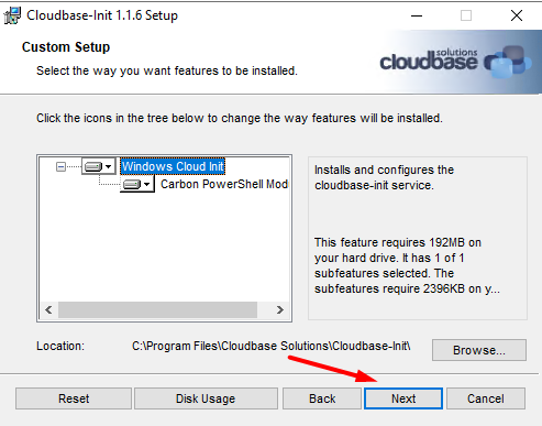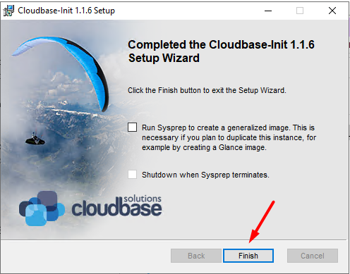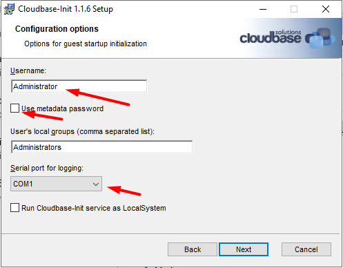 Change username to Administrator and COM1 for serial port for logging. Making sure Use metadata password and Run Cloudbase-Init service as LocalSystem is unticked. following the red arrow as in above image. Click next and proceed with installation.