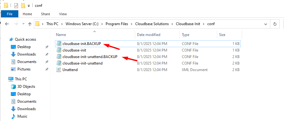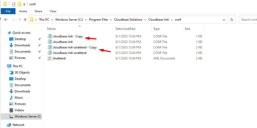 from the Windows Explorer. Make a copy of the conf file cloudbase-init and cloudbase-init-unattend. Rename it to cloudbase-init.BACKUP and cloudbase-init-unattend.BACKUP for backup.