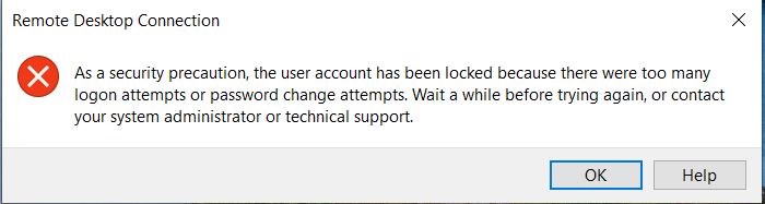“As a security precaution, the user account has been locked because there were too many logon attempts or password change attempts.”